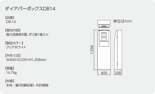 仕様製品名 ダイアパーボックスDB14 品番 DB-14製品カラークリアホワイト(CW)外形寸法(mm)W400×D235×H1,258 質量(kg) 16.7 材質本体:鋼(防錆処理)、スチロール樹脂価格¥128,000(税込¥134,400)(ポリ袋1箱、消臭材5個入り・取付工事費別) 施工方法床面と壁面にアンカーボルト等で固定します。